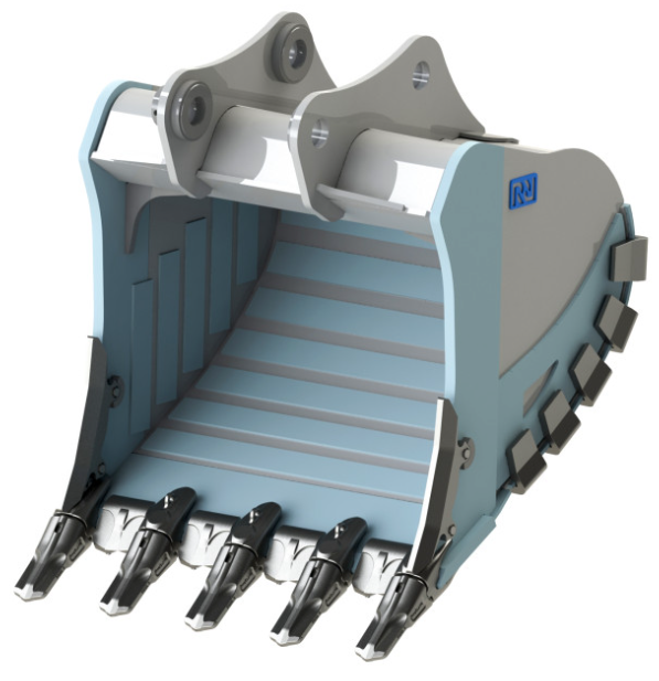 Ковши скальные сверхусиленные применяются для работ с грунтами высокой плотности, в том числе мерзлым. От стандартных моделей они отличаются дополнительной защитой боковин и дна, а также футеровкой из износоустойчивой стали. Подверженные истиранию элементы могут быть изготовлены из износостойкой стали повышенной прочности. Ковши оснащены протектерами для защиты боковины, установлена защита бокового шва и межзубьевая защита Такая конструкция снижает степень износа навесного оборудования.