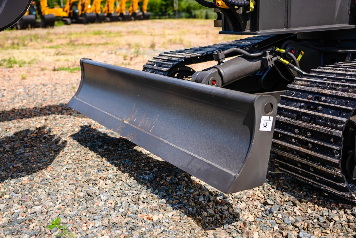 - Оборудован бульдозерным отвалом, увеличивающим устойчивость при выполнении работ. Также позволяет использовать машину для засыпки или планировки.