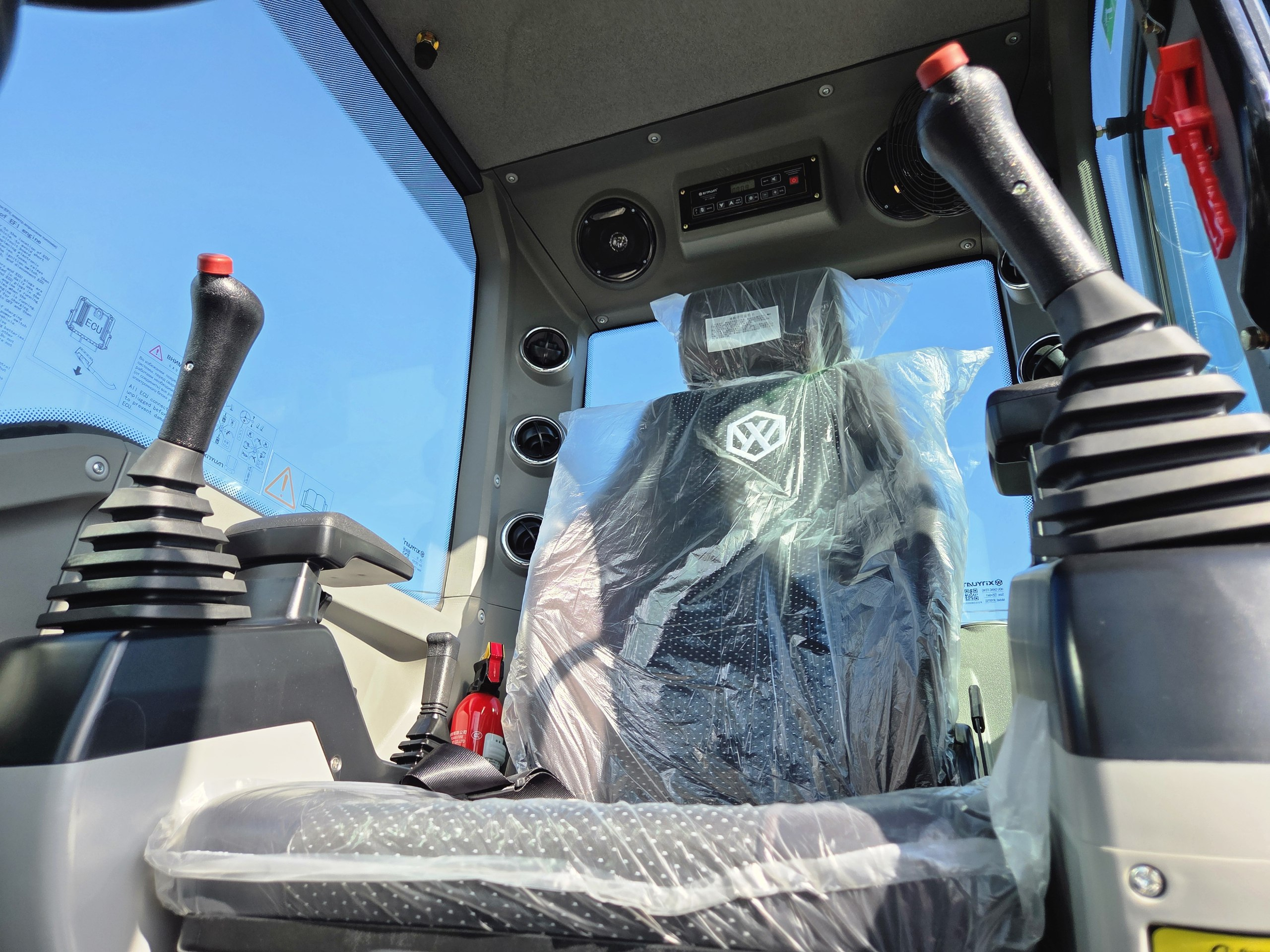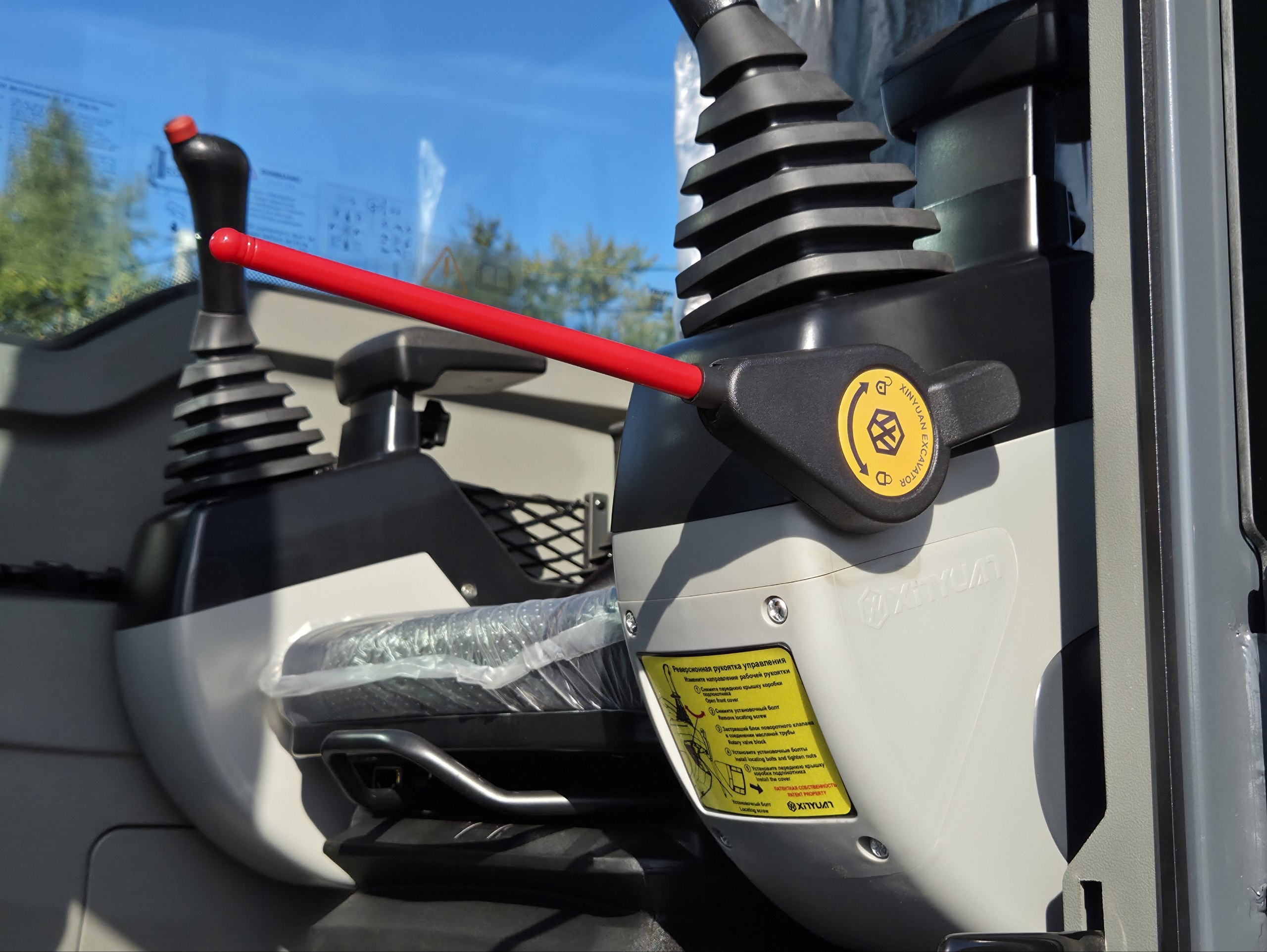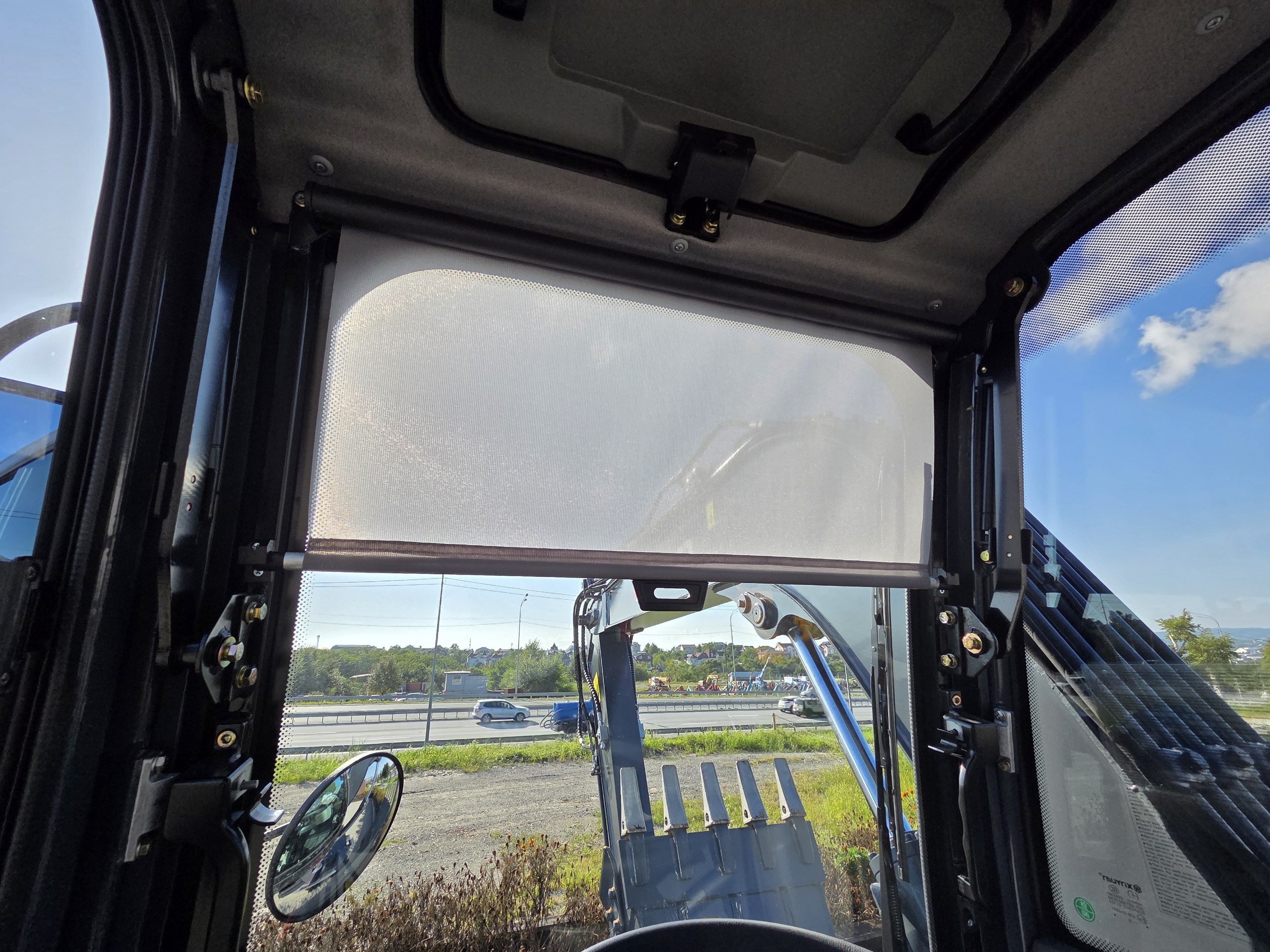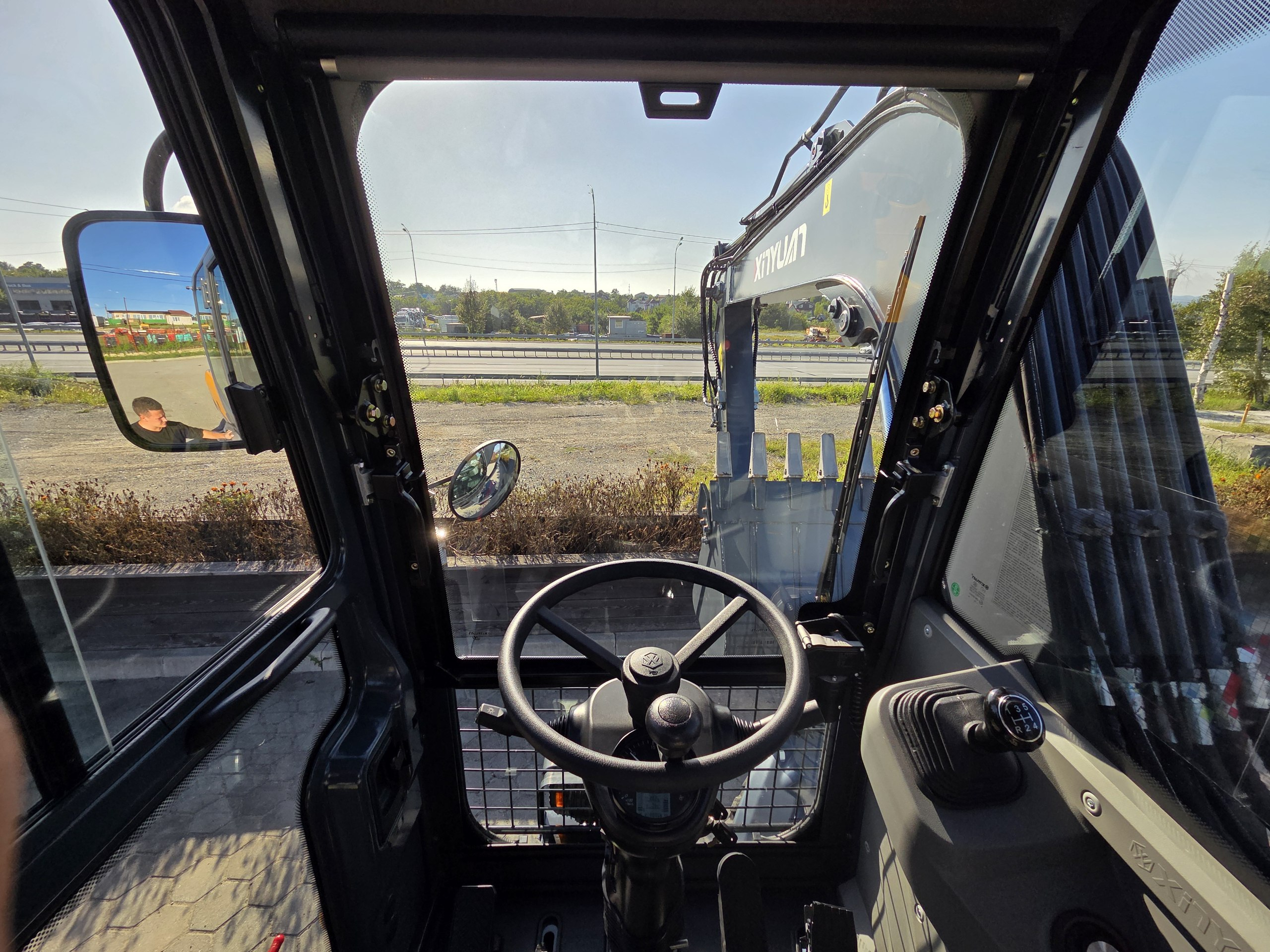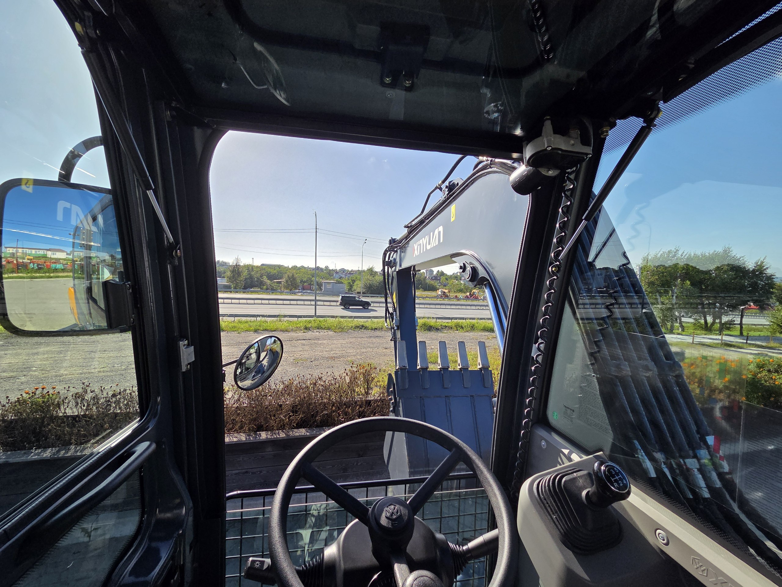 Просторная кабина с панорамными окнами для удобного обзора местности при работах, оборудованная кондиционером и отопителем для комфортной работы в любых погодных условиях.