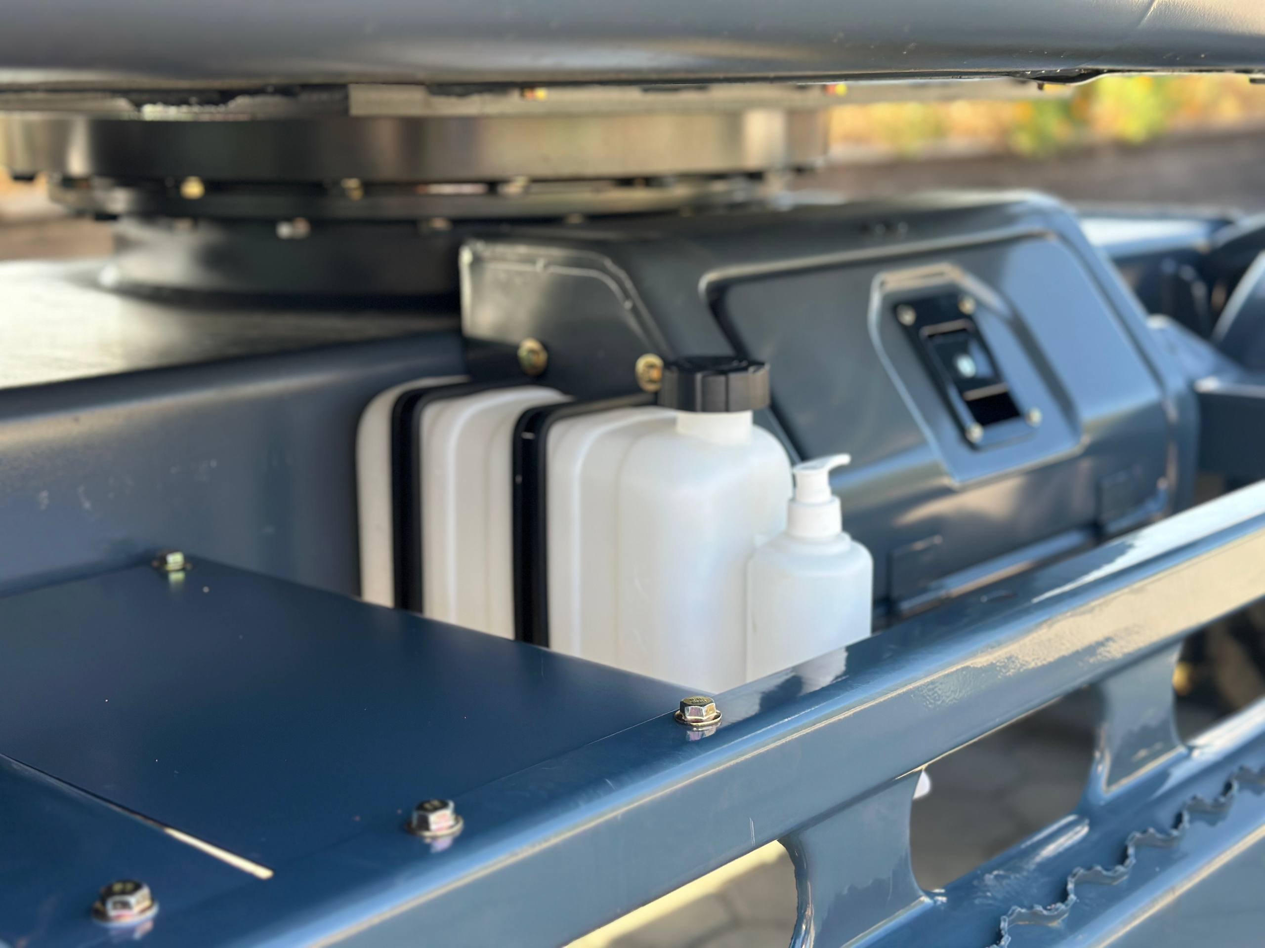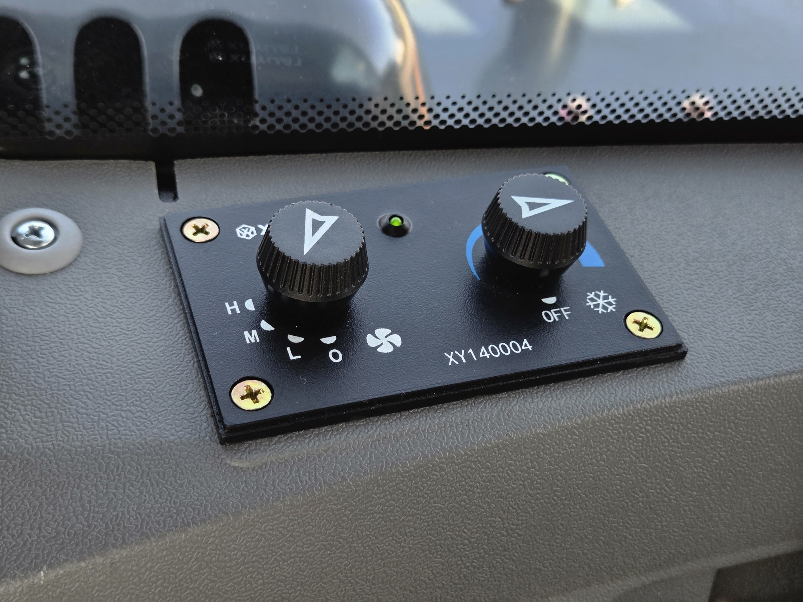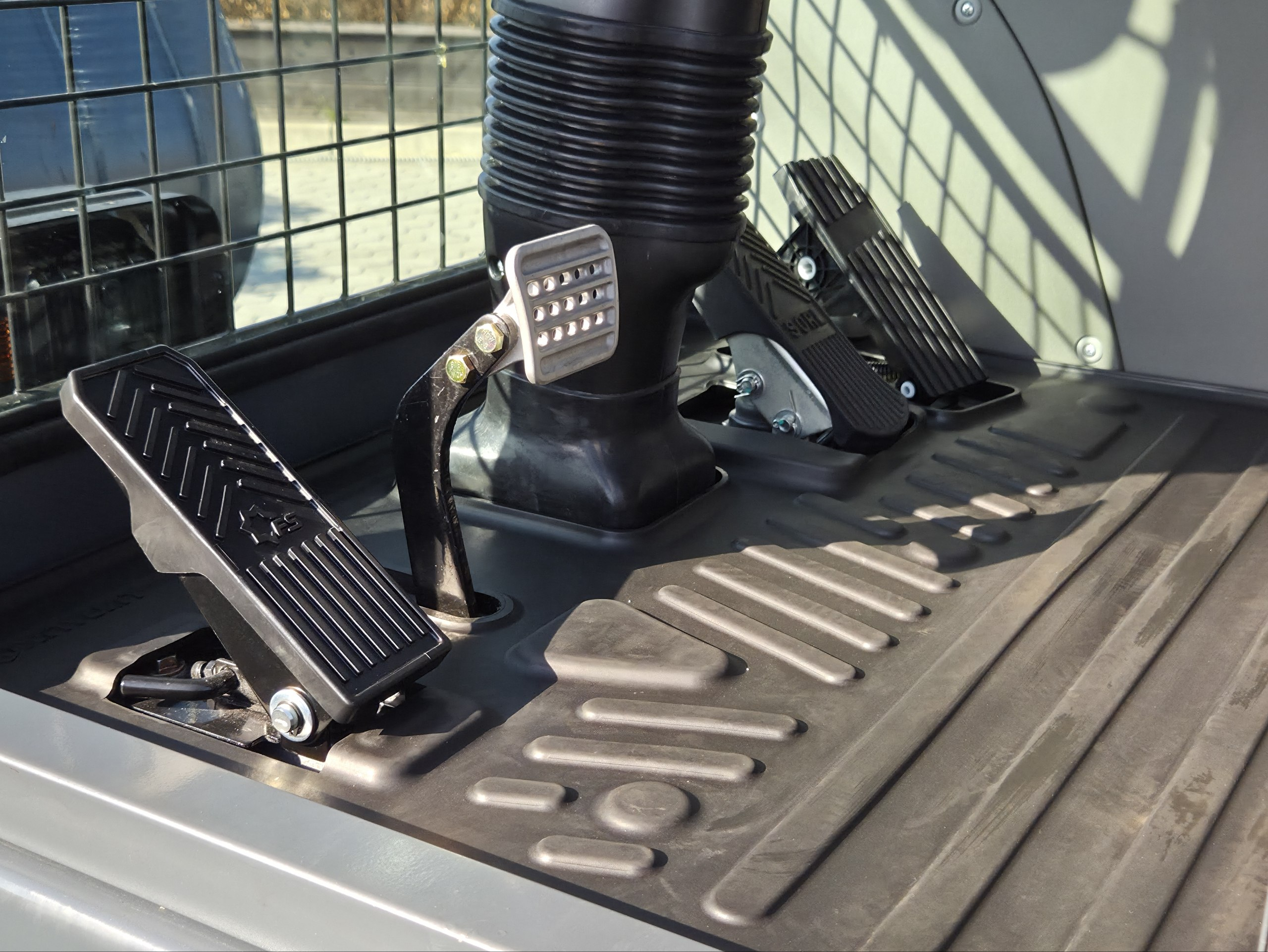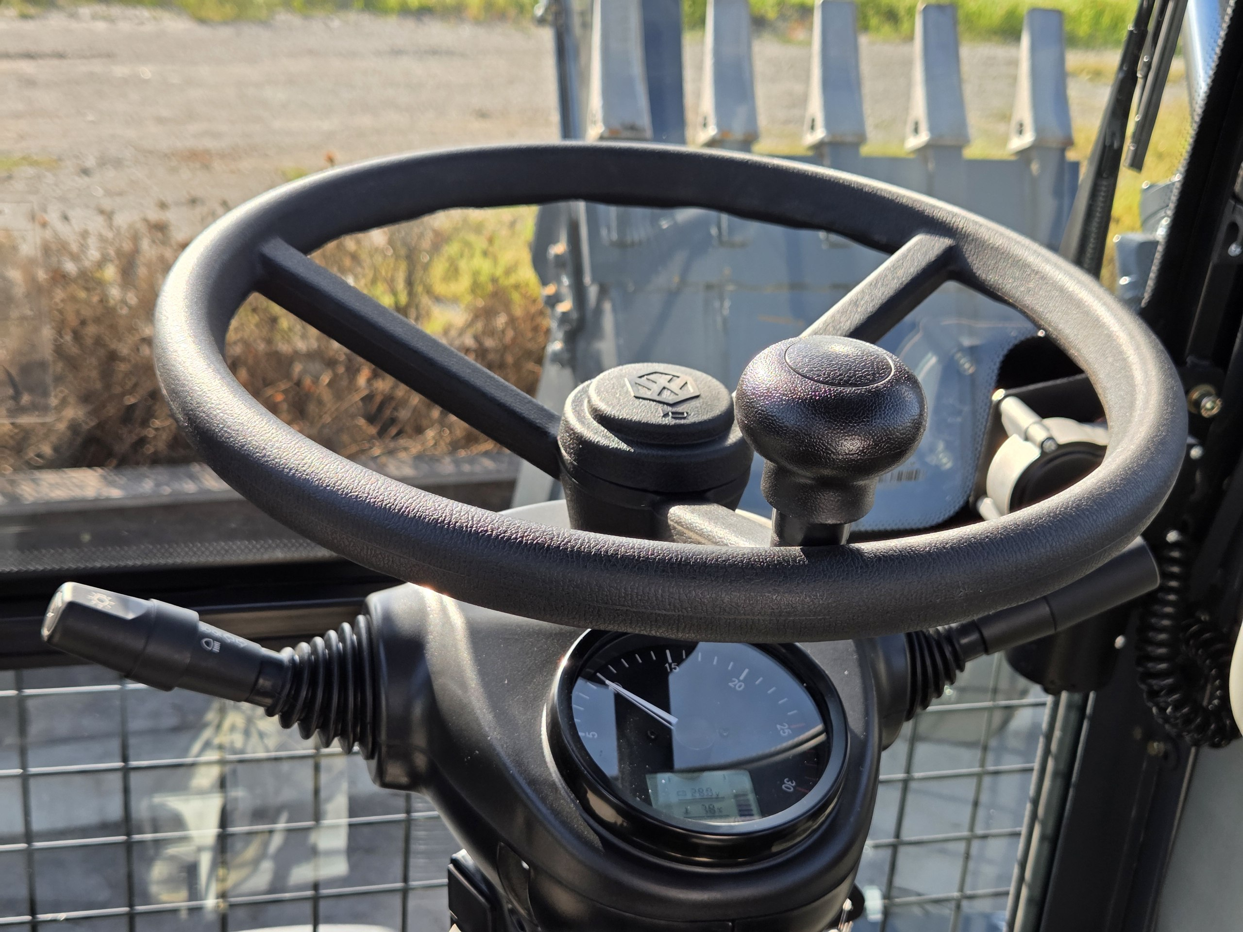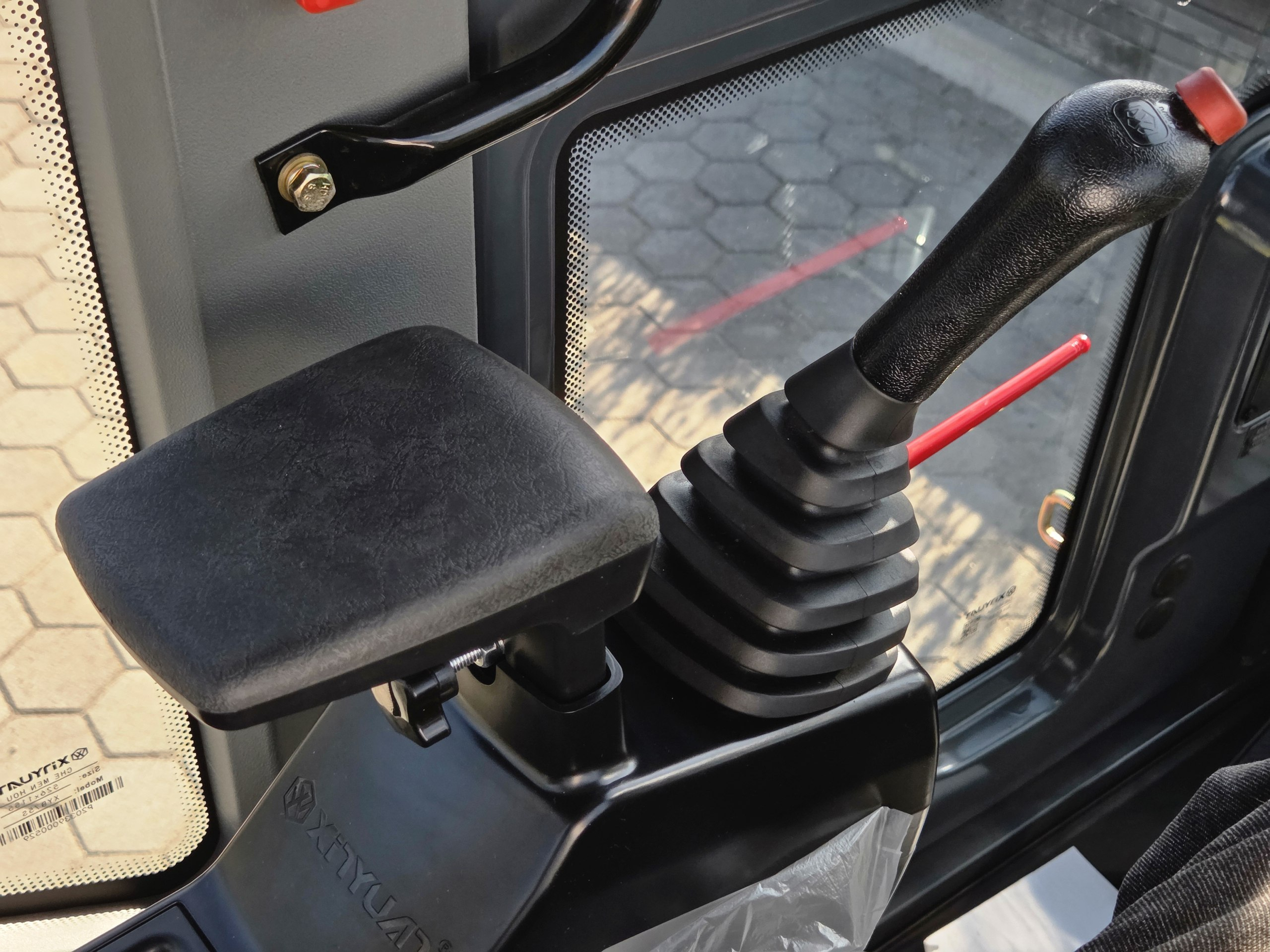 Просторная кабина с панорамными окнами для удобного обзора местности при работах, оборудованная кондиционером и отопителем для комфортной работы в любых погодных условиях.